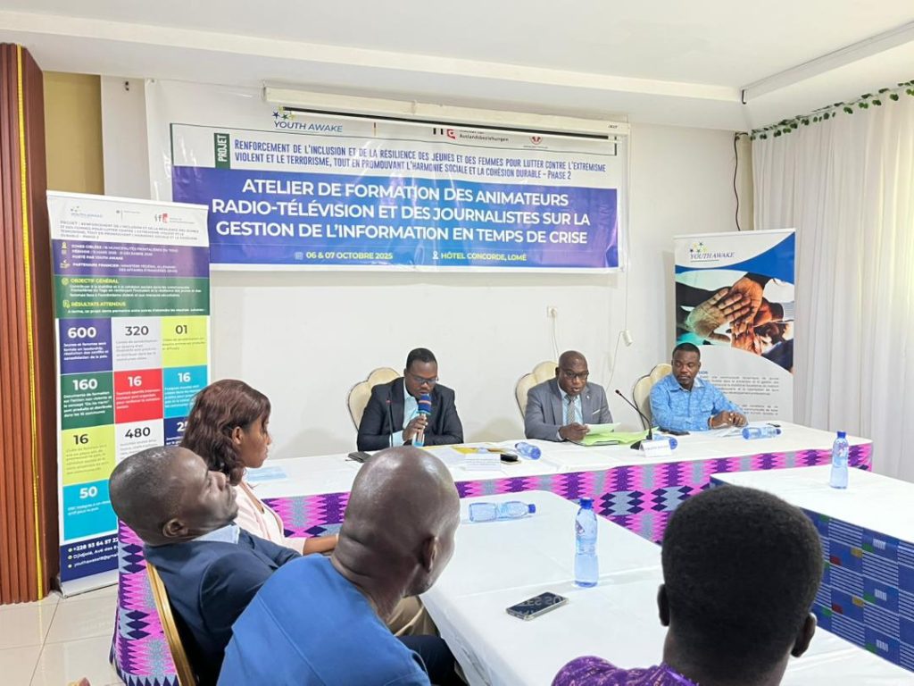 Organisée par l’ONG Youth Awake avec l’appui de l’Institut für Auslandsbeziehungen (ifa), du ministère allemand des Affaires étrangères, en partenariat avec le ministère togolais de la Communication et des Médias et la Haute Autorité de l’Audiovisuel et de la Communication (HAAC), cette formation s’est tenue du 6 au 7 octobre 2025 à l’hôtel Concorde à Lomé. Cette initiative vise à renforcer les capacités des professionnels des médias radio, télévision et presse écrite pour un traitement plus rigoureux et responsable de l’information, notamment en période de tension ou d’incertitude.